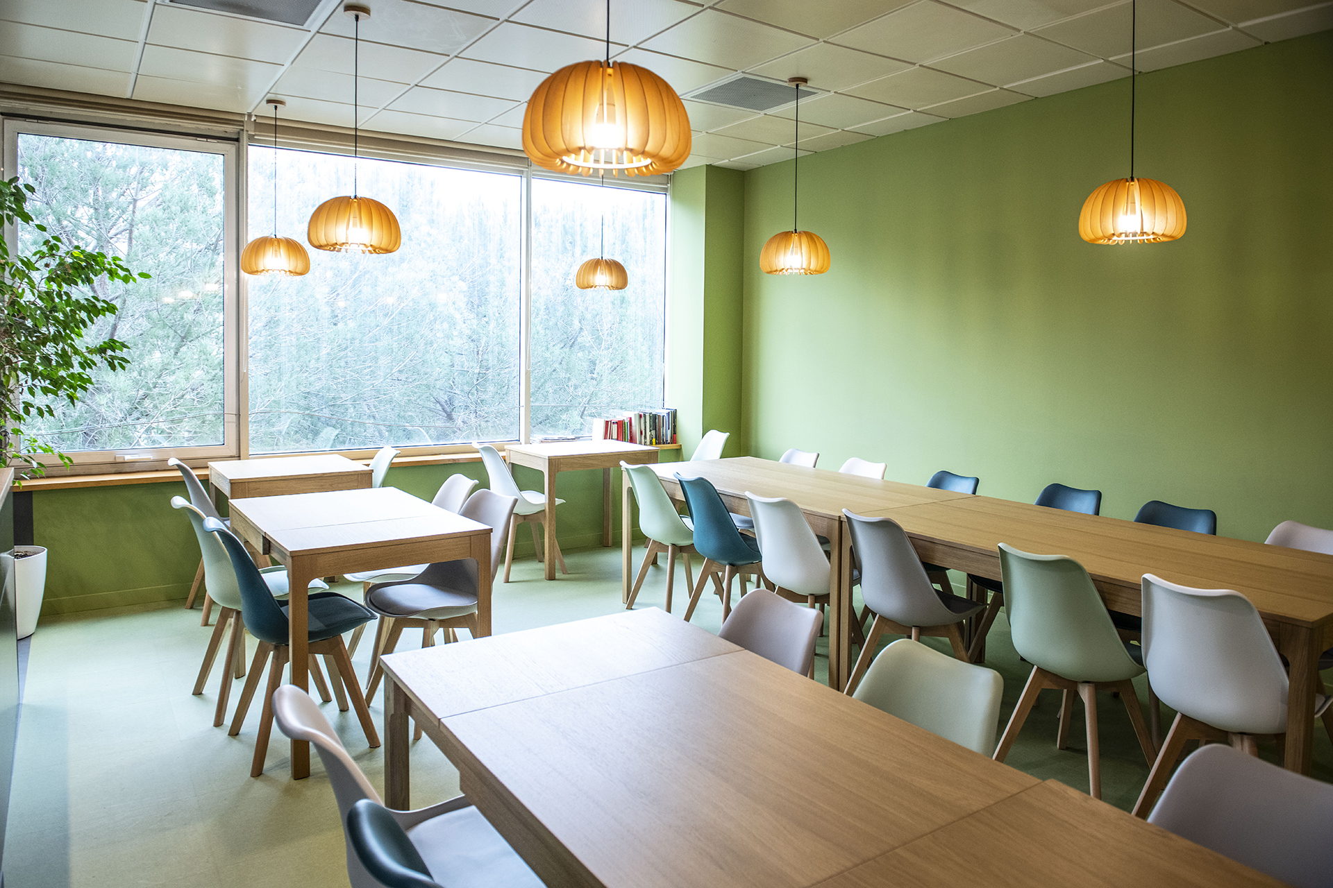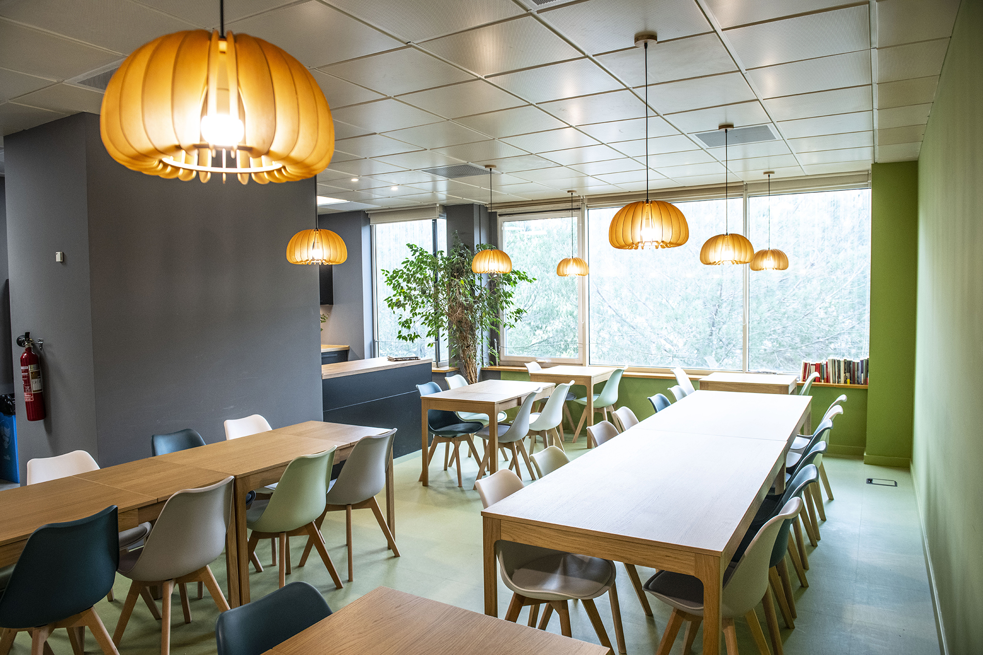 Reforma de un office para la empresa Sigma. El objetivo era crear un espacio agradable para que los trabajadores puedan disfrutar en su tiempo libre en la oficina. Por esta razón se creó un espacio dividido visualmente en dos zonas: una zona verde para comer, descansar, relajarse… y una zona gris para la zona de cocina.